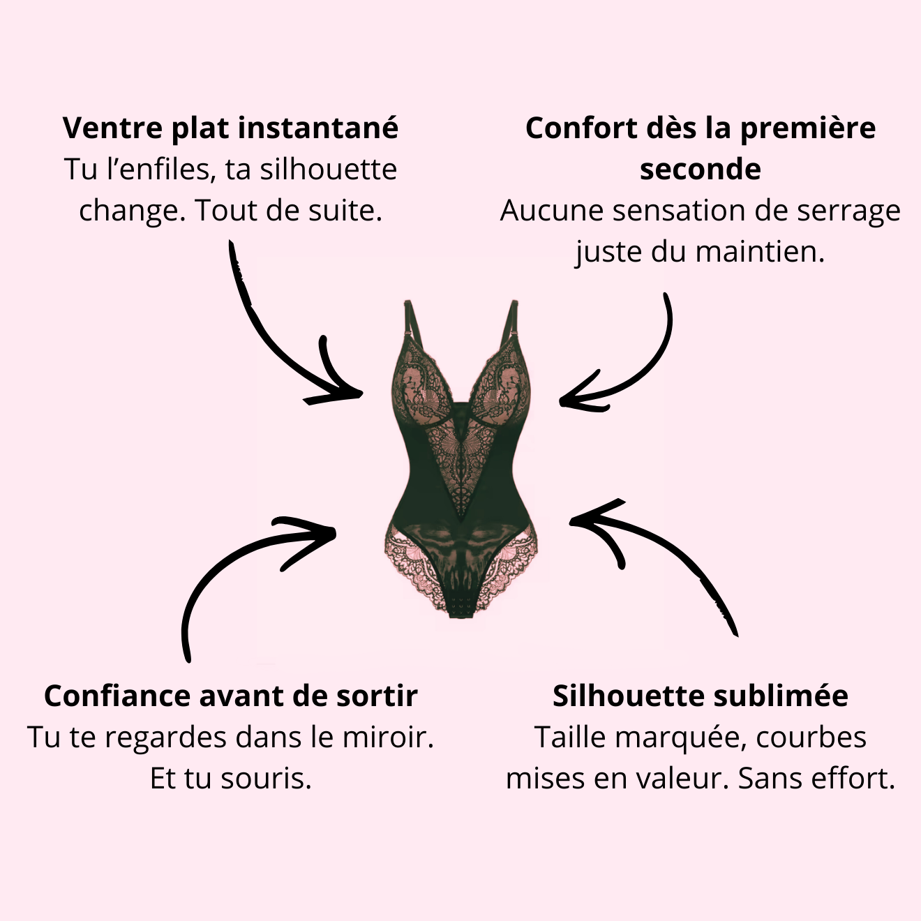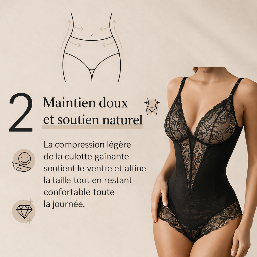 Notre technologie gainante épouse naturellement les courbes du corps pour lisser le ventre et affiner la taille. Le body redessine la silhouette en quelques secondes tout en restant confortable et invisible sous les vêtements.